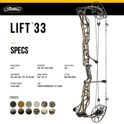 Avec un poids inférieur à 4,3 livres, cette nouvelle génération d'arcs de chasse Mathews de 33" utilise la toute nouvelle came SwitchWeight-X qui offre des vitesses allant jusqu'à 343 FPS tout en restant particulièrement silencieuse. Le LIFT 33 dispose de branches RPD™ réimaginées pour minimiser les vibrations après le tir, d'un nouveau système d'axe supérieur pour une excellente stabilité et il est équipé de toutes nouvelles cordes d'arc MATCH ™ pour éliminer l'étirement et la rotation de la visette. Tout ce qui est mis dans le LIFT est fait pour offrir un niveau plus élevé de chasse à l'arc.