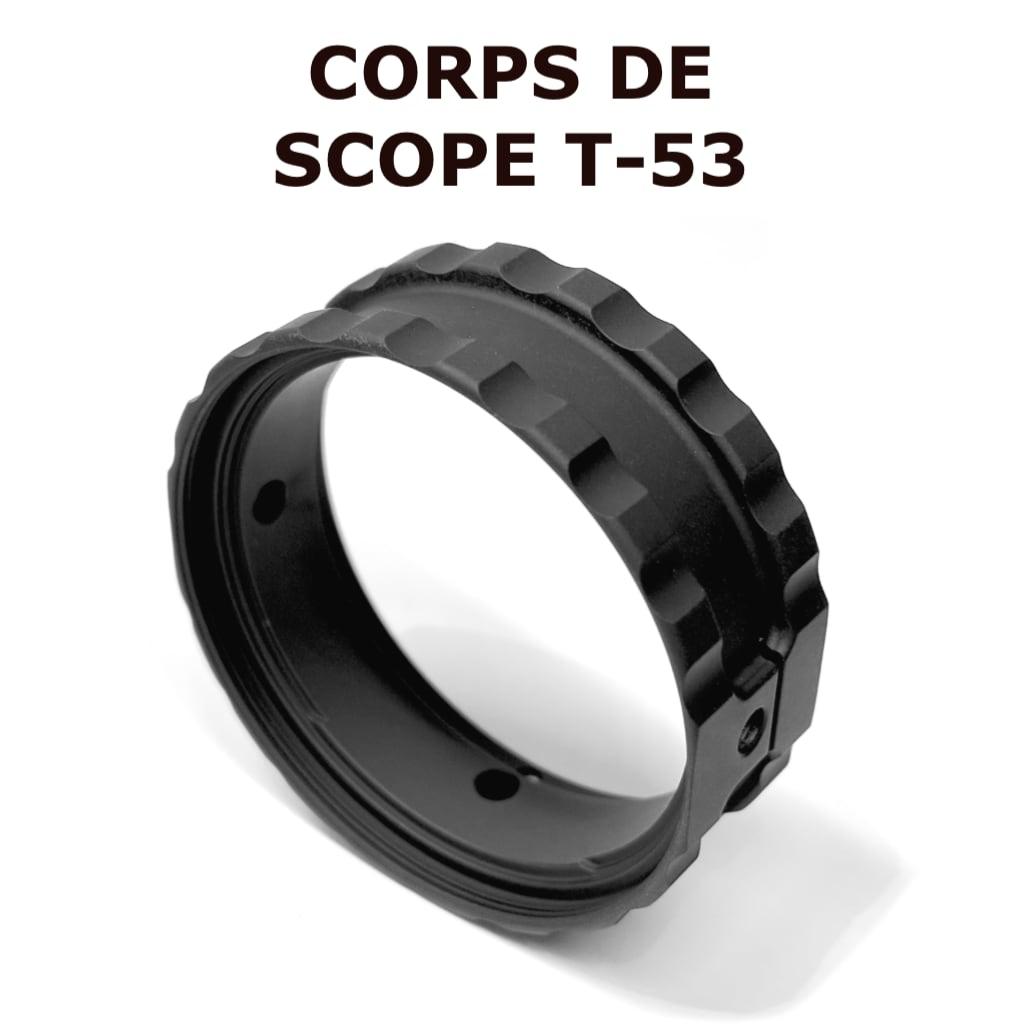 La version "numéro 1" de ce scope est la version "économique" ; vous pouvez transférer l'ensemble des accessoires de votre ancien scope customisé Super D sur le tout NOUVEAU T-53 sans aucun problème (tige filétée, écrou, pin en N10-32 UNF, fibre optique, lentille Super D et vos anciens capots de protection)